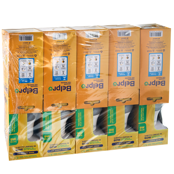 Lâmpadas produzidas em LED da marca Belpro, contendo 9W e 10 unidades por embarque.