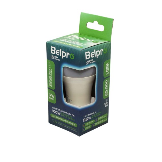 Lâmpada produzida em LED da marca Belpro, com potência 17W e tensão 127-220V, contendo 100 unidades por embarque.