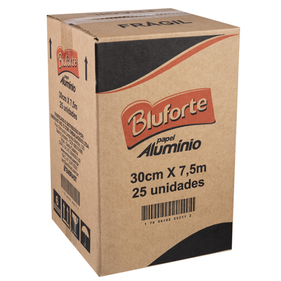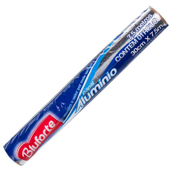 Papel produzido em folhas de alumínio da marc Bluforte, com tamanhos 30cm por 7,5m, contendo 25 unidades por embarque.
