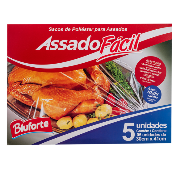 Sacos Assadofácil produzidos em poliéster da marca Bluforte, com tamanho 30cm por 41m, contendo 5 unidades em casa embalagem.