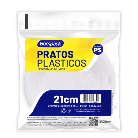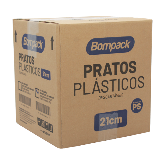 Pratos descartáveis produzidos em poliestireno (PS) da marca Bompack, com diâmetro 21cm e modelo BPF-21, contendo 10 unidades por embalagem e 40 embalagens por embalagem.