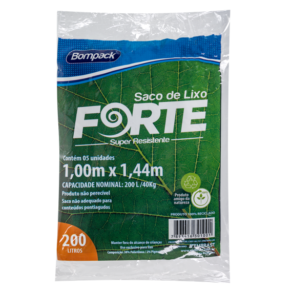 Saco de lixo produzido 98% em polietileno (PE) e 2% em pigmentos da marca Bompack, com tamanho 100x144cm e capacidade 200l, contendo 5 unidades por embalagem.