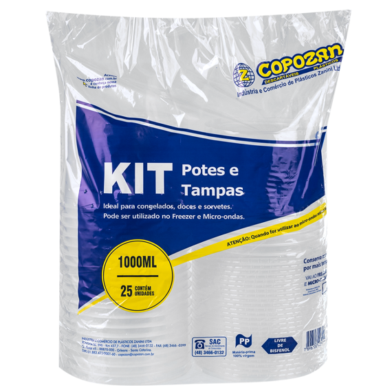 Kit pote/tampa produzidos em polipropileno (PP) da marca Copozan, com capacidade 1000ml, contendo 25 unidades por embalagem e 6 embalagens por embarque.
