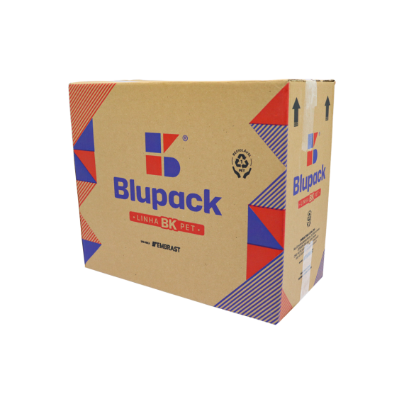 Embalagem produzida em polietileno tereftalato (Pet) da marca Blupack, no modelo BK-32, contendo 100 unidades por embarque.