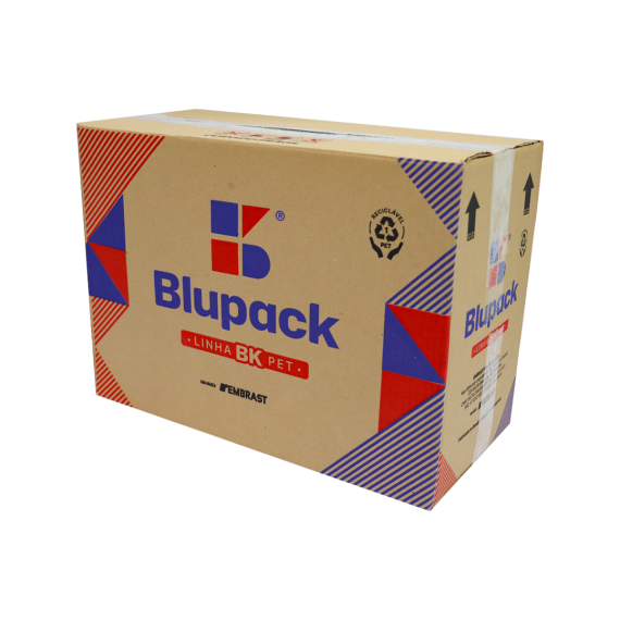 Embalagem produzida em polietileno tereftalato (Pet) da marca Blupack, no modelo BK-32, contendo 100 unidades por embarque.