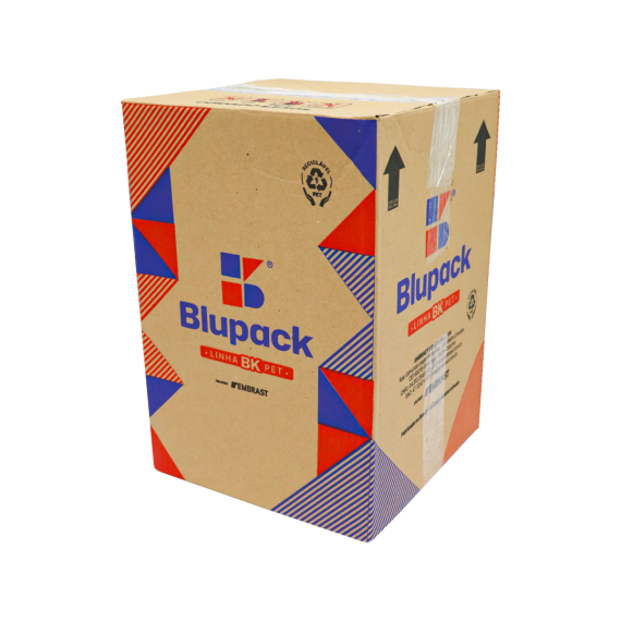 Embalagem produzida em polietileno tereftalato (Pet) da marca Blupack, no modelo BK-32, contendo 50 unidades por embarque.