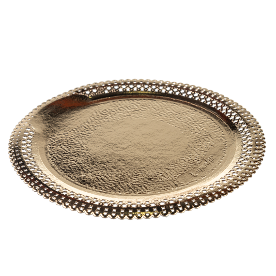 Prato italiano produzido em papelão com tripla camada e filme de poliuretano dourado da marca King Pack, com tamanho 14x18cm e modelo N1, contendo 10 unidades por fardo e 10 fardos por embarque.