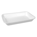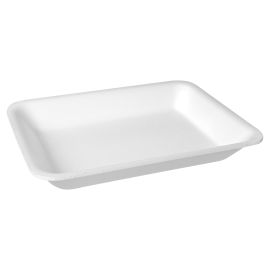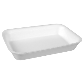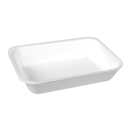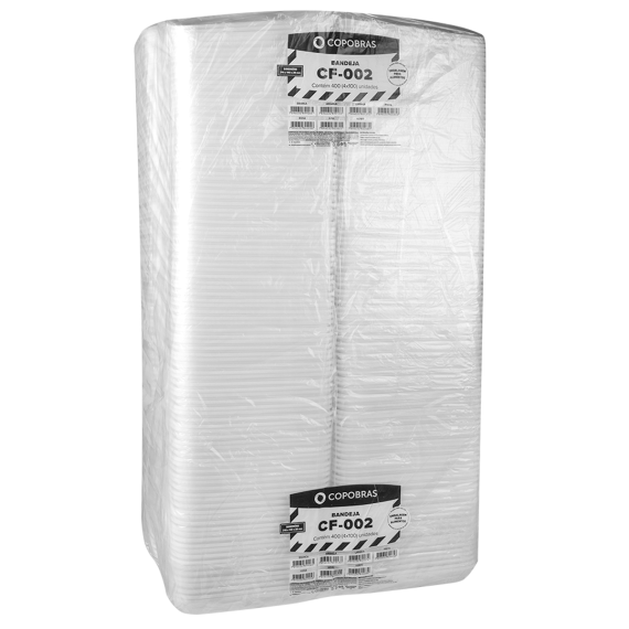 Bandejas produzidas em poliestireno expandido (EPS) da marca Copobras, com tamanho 21x14x2,8cm e modelo CF-02, contendo 400 unidades por embarque.