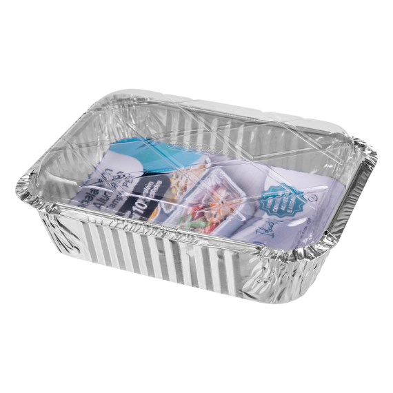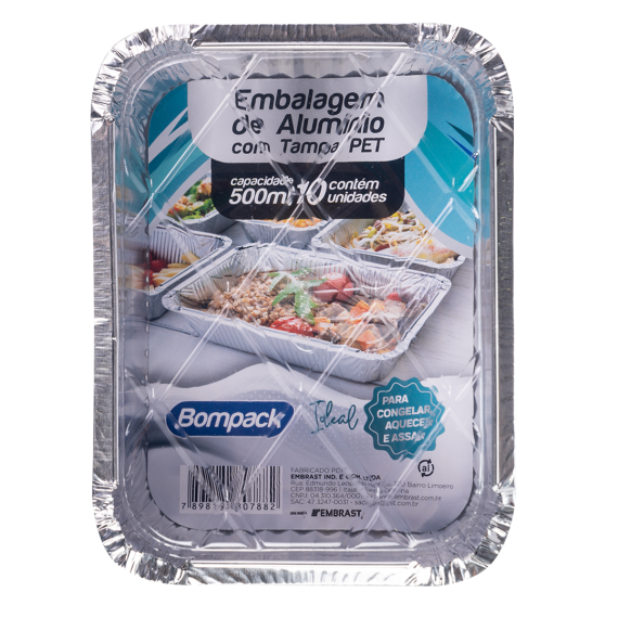 Formitas produzidas em folha de alumínio e tampas produzidas em polietileno tereftalato (Pet) da marca Bompack, com tamanho 11,5x16x4cm e capacidade 500ml, contendo 10 unidades por fardo e 12 fardos por embarque.
