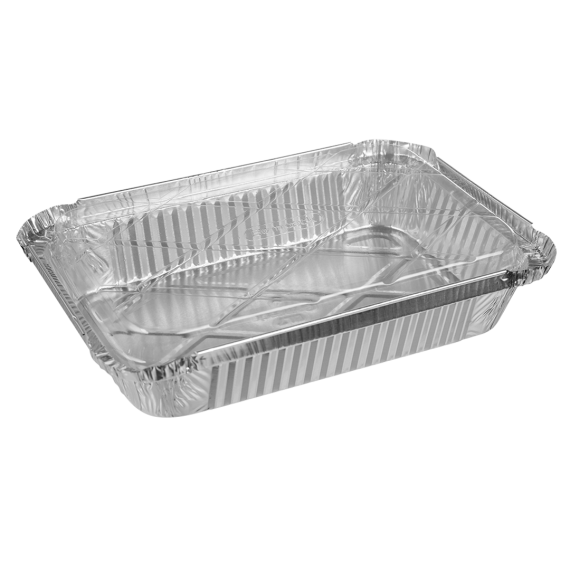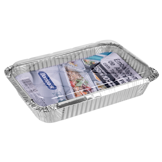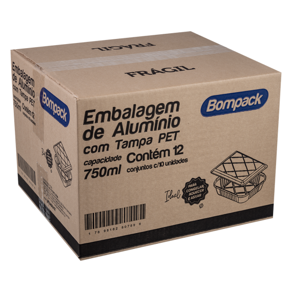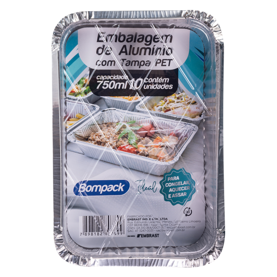 Formitas produzidas em folha de alumínio e tampas produzidas em polietileno tereftalato (Pet) da marca Bompack, com tamanho 13x19,5x4cm e capacidade 750ml, contendo 10 unidades por fardo e 12 fardos por embarque.