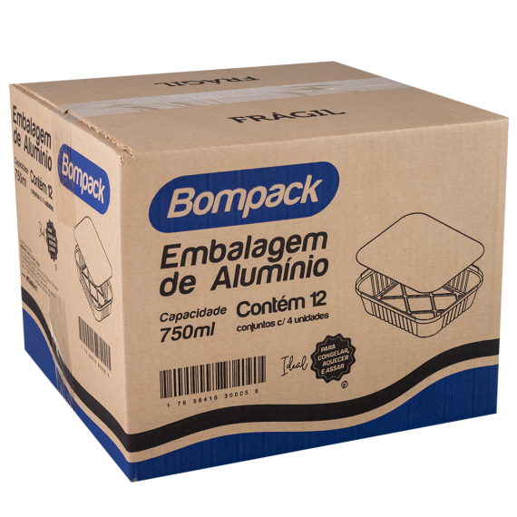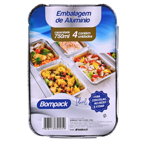 Formitas produzidas em folhas de alumínio da marca Bompack, com tamanho 21,8x15x4,1cm e capacidade 750ml, contendo 4 unidades por fardo e 12 fardos por embarque.