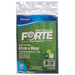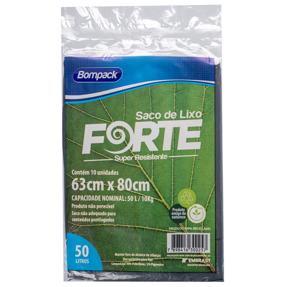 Saco de lixo produzida 98% em polietileno (PE) e 2% em pigmentos da marca Bompack, com capacidade 50L e tamanho 63x80cm, contendo 10 unidades por embalagem.