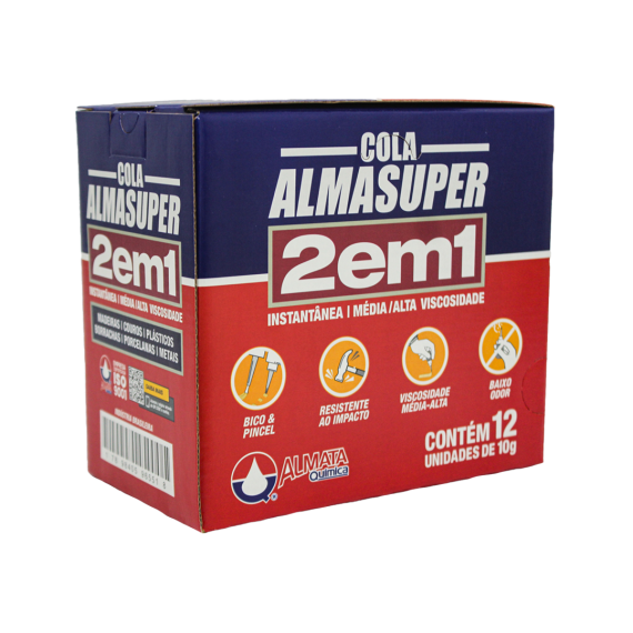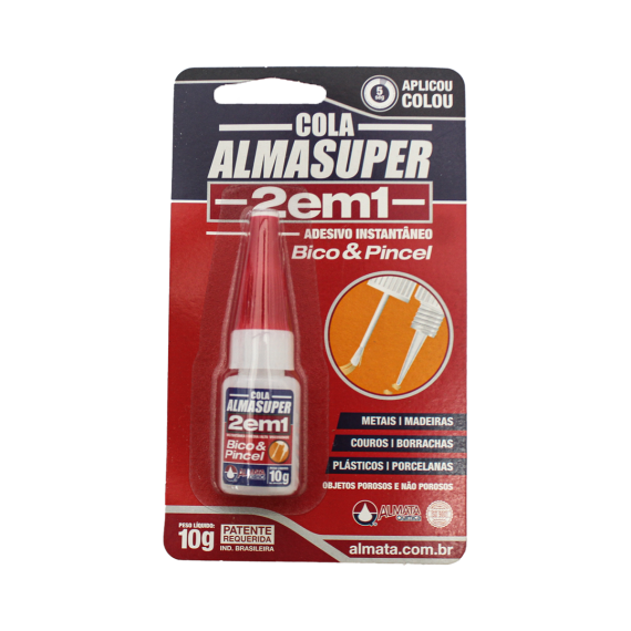 Cola produzida em Etil-2 cianoacrilato da marca Almasuper, com capacidade 10g, contendo 12 unidades por caixa e 48 caixas por embarque.