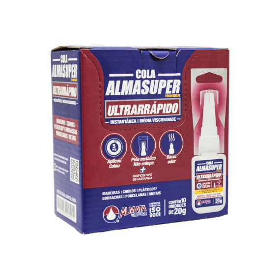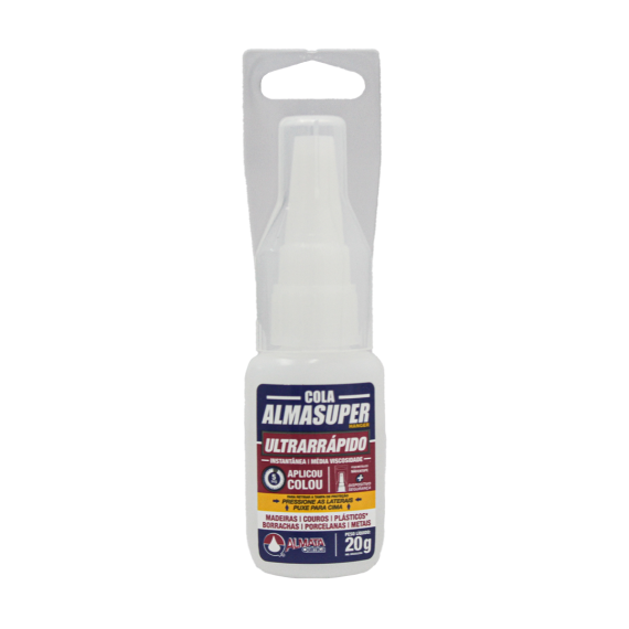 Cola produzida em Etil-2 cianoacritato da marca Almasuper, com capacidade de 20g, contendo 10 unidades por caixa e 30 caixas por embarque.