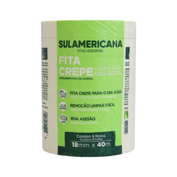 Fita produzida em substrato de papel crepe e adesivo à base de borracha natural da marca Sulamericana, com tamanho 18mm por 40m, contendo 8 unidades por embalagem e 48 embalagens por embarque.