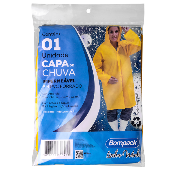 Capa de chuva produzida em PVC forrado da marca Bompack, com tamanho 135x65cm e contendo 10 unidades por embarque.