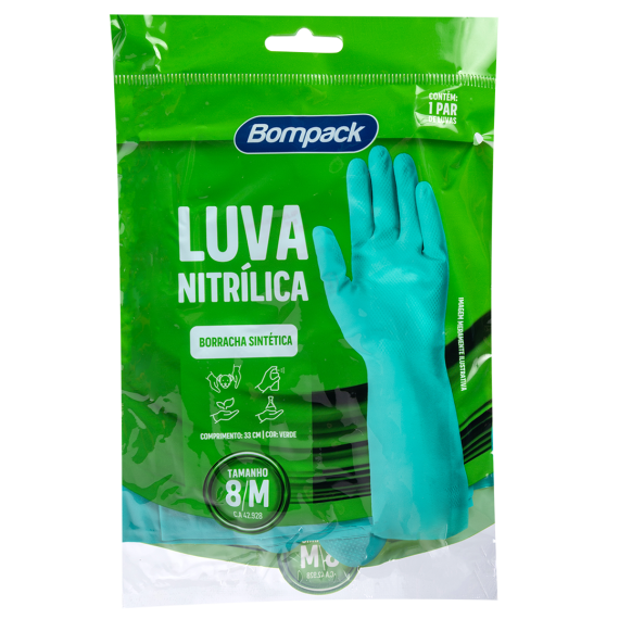 Luvas produzidas em borracha sintética de nitrilo, forrada com flocos de algodão da marca Bompack, com tamanho M (33cm), contendo 1 unidade (par) por embalagem e 144 unidades por embarque.
