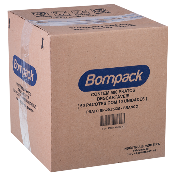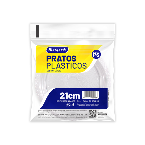 Pratos descartáveis produzidos em poliestireno (PS) da marca Bompack, com diâmetro 21cm e modelo BP-21, contendo 10 unidades por embalagem e 50 embalagens por embarque.