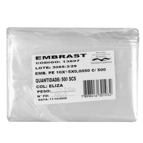Embalagem produzido em polietileno (PE) da marca Embrast, com tamanhos 10x15cm e 5mm, com 500 unidades por embarque.