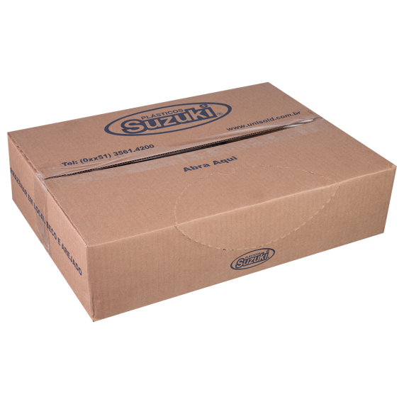 Sacos plásticos produzidos em polietileno de alta densidade (PEAD) da marca Suzuki, com tamanho 28x39cm e contendo 1000 unidades por embarque.