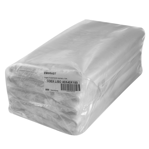 Sacos plásticos produzidos em polietileno co-extrusado (COEX) da marca Suzuki, com tamanho 40x40cm e espessura 15mm, contendo 500 unidades por embarque.