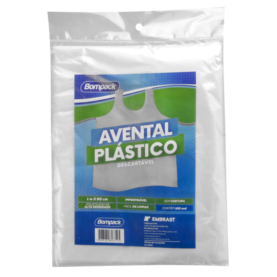 Avental produzido com polietileno de alta densidade (PEAD) da marca Bompack, com tamanho 100x60cm, contendo 100 unidades por fardo e 10 fardos por embarque.