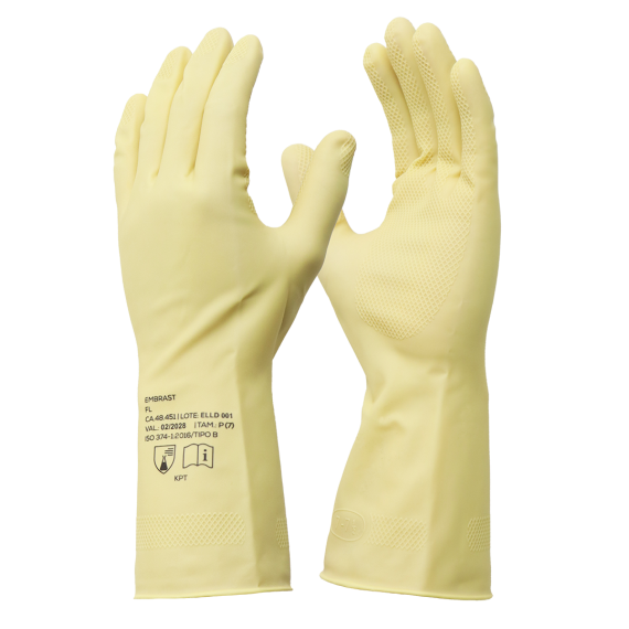 Composição: Luva de látex natural anatômica, superfície externa antiderrapante na face palmar e dedos.