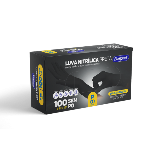 A luva nitrílica Bompack preta é confeccionada em borracha nitrílica sem pó. Lisa, ambidestra, de uso único, hipoalergênica, sem látex, com virola no punho, não esterilizada e de cor preta. Contendo 100 unidades por caixa e 20 caixas por embarque.