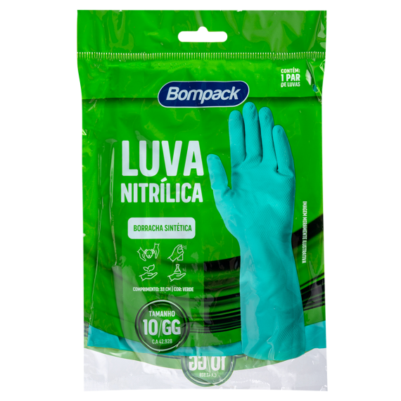 Luvas produzidas em borracha sintética de nitrilo da marca Bompack, com tamanho GG (33cm), contendo 1 unidade (par) por embalagem e 144 embalagens por embarque.