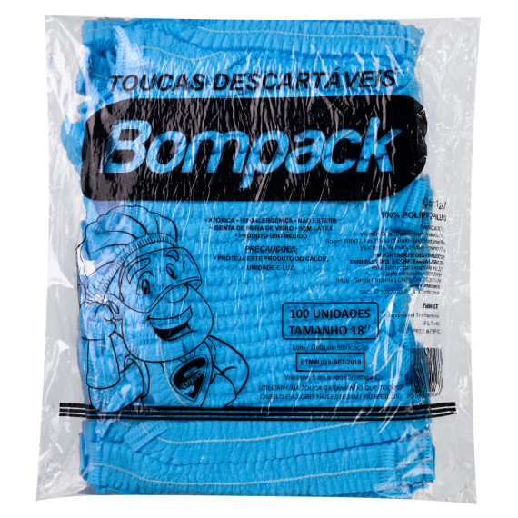 Touca sanfonada produzida 100% polipropileno (PP) e elástico da marca Bompack, com tamanho 18" (45x50cm) e contendo 100 unidades por embalagem e 50 embalagens por embarque.