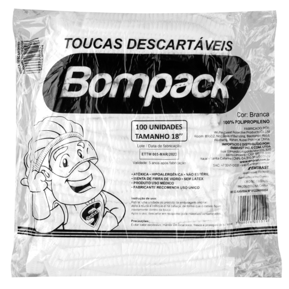 Touca sanfonada produzida 100% polipropileno (PP) e elástico da marca Bompack, com tamanho 45x50cm e modelo nº 18, contendo 100 unidades por embalagem e 50 embalagens por embarque.