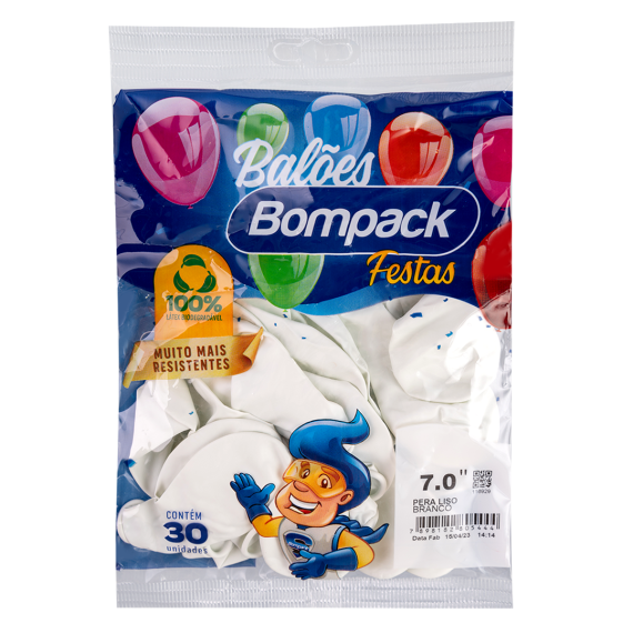Balões produzidos em látex natural, antioxidantes, estabilizantes e pigmentos da marca Bompack, no modelo N7, contendo 30 unidades por embalagem e 30 embalagens por embarque.
