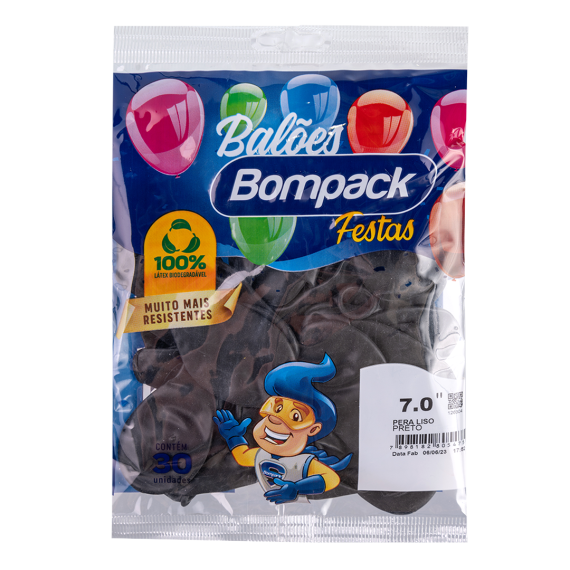 Balões produzidos em látex natural, antioxidantes, estabilizantes e pigmentos da marca Bompack, no modelo N7, contendo 30 unidades por embalagem e 30 embalagens por embarque.