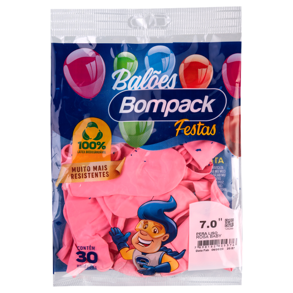 Balões produzidos em látex natural, antioxidantes, estabilizantes e pigmentos da marca Bompack, no modelo N7, contendo 30 unidades por embalagem e 30 embalagens por embarque.