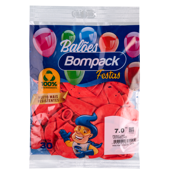 Balões produzidos em látex natural, antioxidantes, estabilizantes e pigmentos da marca Bompack, no modelo N7, contendo 30 unidades por embalagem e 30 embalagens por embarque.