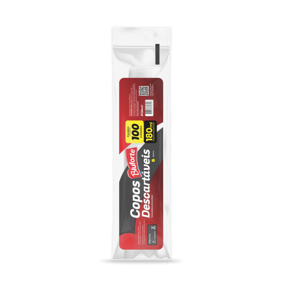 Copos descartáveis produzidos em poliestireno (PS) da marca Bluforte, com capacidade 180ml e modelo 180-TR-PS, contendo 100 unidades por embalagem e 25 embalagens por embarque.