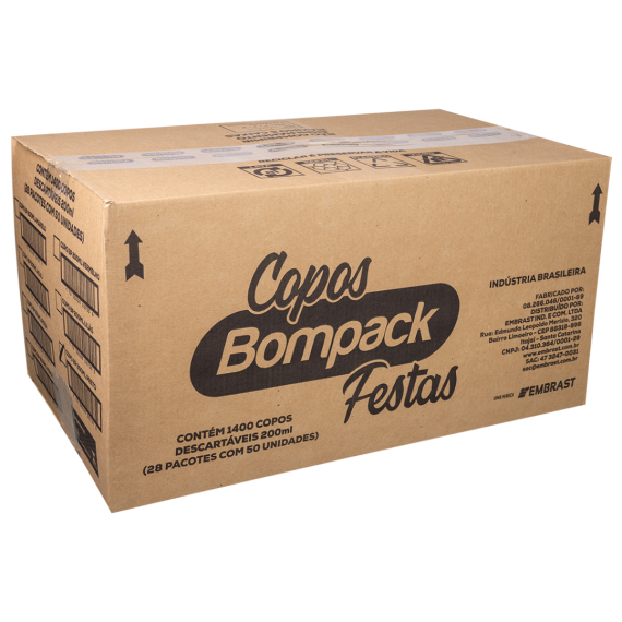 Copos descartáveis produzidos em poliestireno (PS) da marca Bompack, com capacidade 200ml, contendo 50 unidades por embalagem e 28 embalagens por embarque.