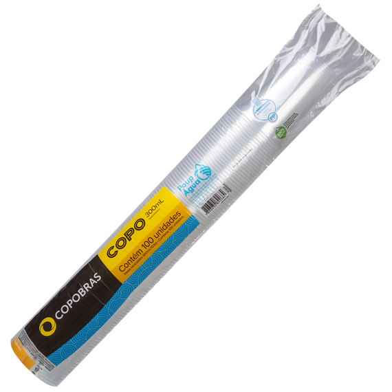 Copos descartáveis produzidos em polipropileno (PP) da marca Copobras, no modelo CFT-300 e comportando até 300ml, contendo 100 unidades por embalagem e 20 embalagens por embarque.