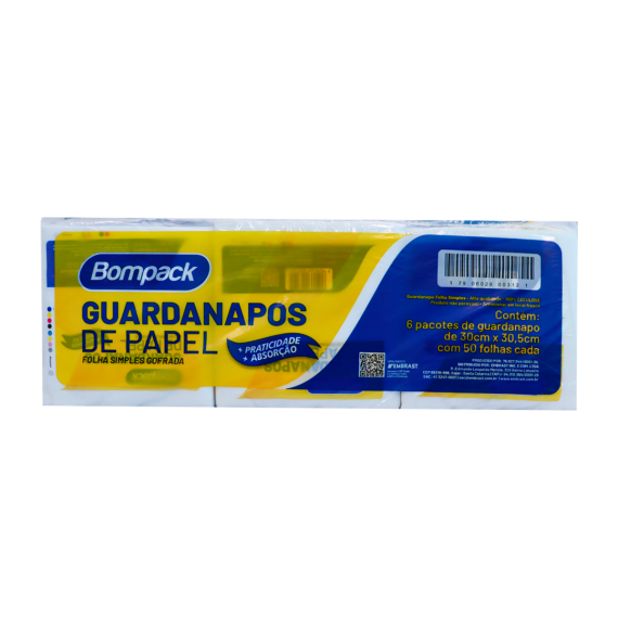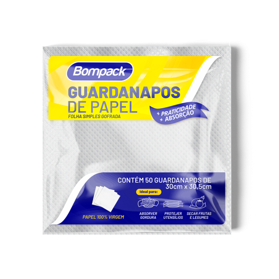 Guardanapos produzidos 100% em fibra de celulose da marca Bompack, com tamanho 30cm, contendo 50 unidades por embalagem e 36 embalagens por embarque.