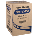 Papel produzido em folhas de alumínio da marca Bompack, com tamanho 30cm por 4m e contendo 25 folhas por rolo.