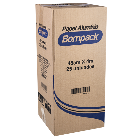 Papel produzido em folhas de alumínio da marca Bompack, com tamanho 45cm por 4m e contendo 25 folhas por rolo.