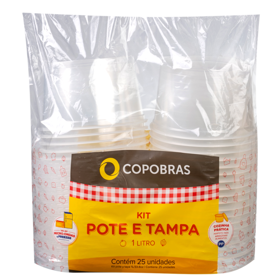 Kit pote/tampa produzidos em polipropileno (PP) da marca Copobras, com capacidade para 1000ml e contendo 25 unidades por embalagem e 8 embalagens por embarque.