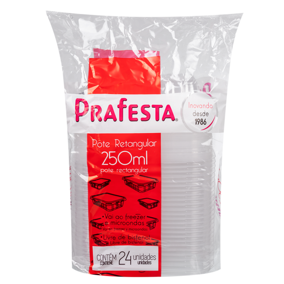 Potes produzidos em polipropileno (PP) da marca Prafesta, com capacidade 250ml e tamanho 14,7x10,2x4,3cm, contendo 24 unidades por embalagem e 6 embalagens por embarque.