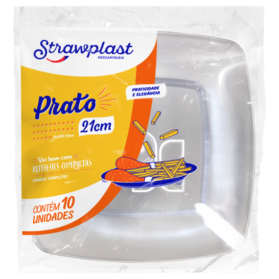 Pratos descartáveis produzidos em poliestireno (PS) e pigmentos atóxicos da marca Strawplast, com diâmetro 21cm e modelo PQC-21, contendo 10 unidades por embalagem e 14 embalagens por embarque.
