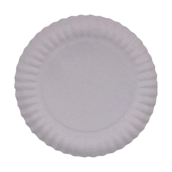 Pratos produzidos em papel da marca Indepal, com diâmetro 16,5cm e modelo N3, contendo 100 unidades por embarque.