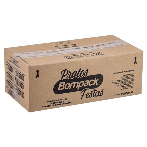 Pratos descartáveis produzidos em poliestireno (PS) da marca Bompack, com diâmetro 15cm e contendo 10 unidades por embalagem e 50 embalagens por embarque.