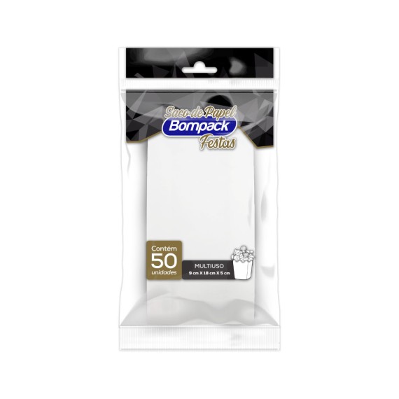 Sacos de papel produzidos 100% em celulose da marca Bompack, com tamanho 18x9x5cm, contendo 50 unidades por embalagem e 12 embalagens por embarque.