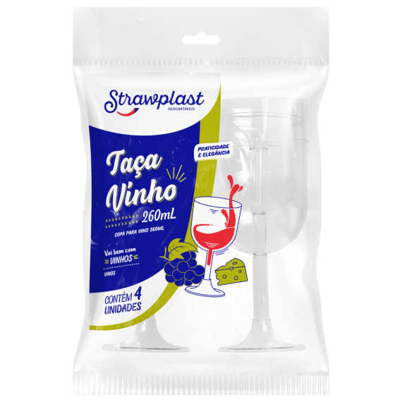 Taça produzida em poliestireno (PS) e pigmentos atóxicos da marca Strawplast, no modelo TC-260 e capacidade de 260ml, contendo 4 unidades por embalagens e 14 embalagens por embarque.