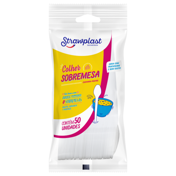 Colheres produzidas em poliestireno (PS) e pigmentos atóxicos da marca Strawplast Linha Festa, com tamanho 12,3x2,5cm e modelo CSB-62, contendo 50 unidades por embalagem e 20 embalagens por embarque.