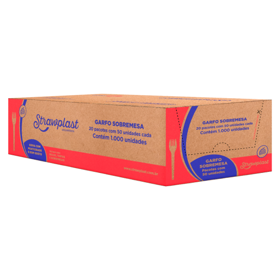 Garfos produzidos em poliestireno (PS) e pigmentos atóxicos da marca Strawplast Linha Festa, com tamanho 12,9x2,3cm e modelo GSA-522, contendo 50 unidades por embalagem e 20 embalagens por embarque.